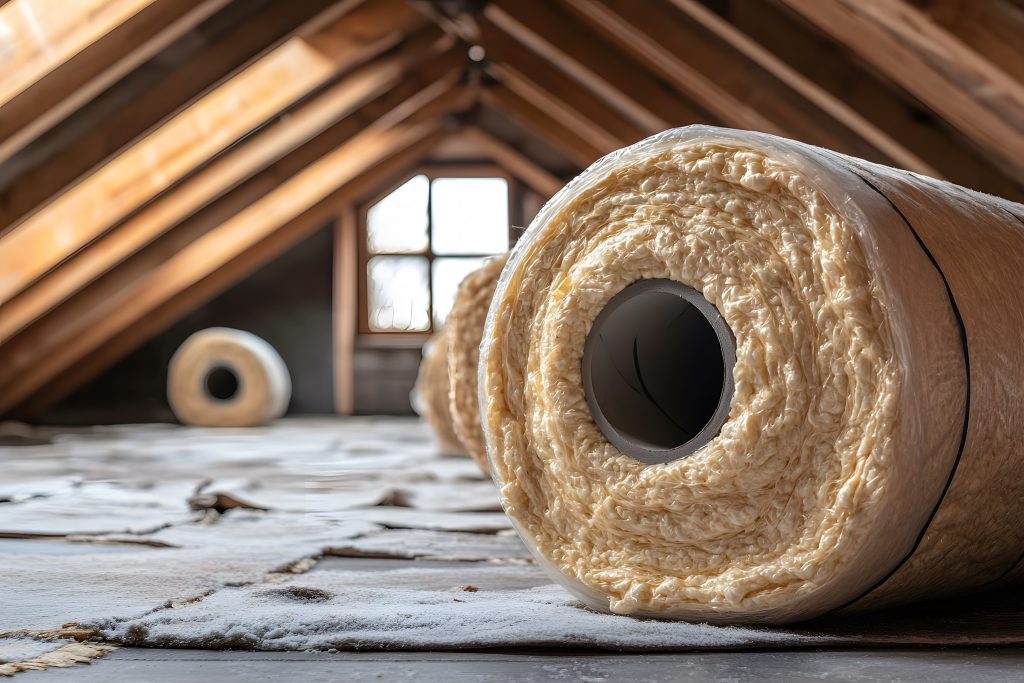Insulation rolls sit in a wooden attic space, ready for installation. the scene emphasizes sustainable energy solutions and home improvement, showcasing the importance of insulation for temperature regulation and energy conservation.